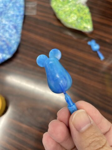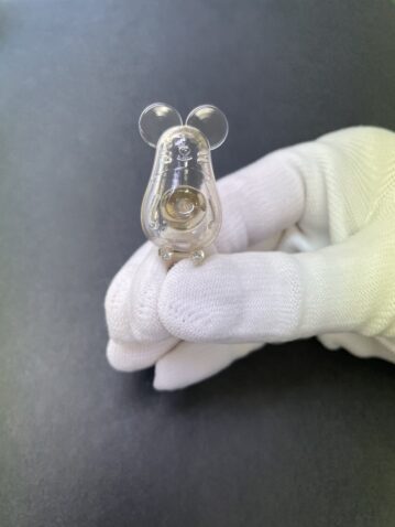 キャップではなく ペットボトルのリサイクル100%材で成形してみました。キレイな透明に仕上がりました。が、ねずこんのおなかにおへそ…